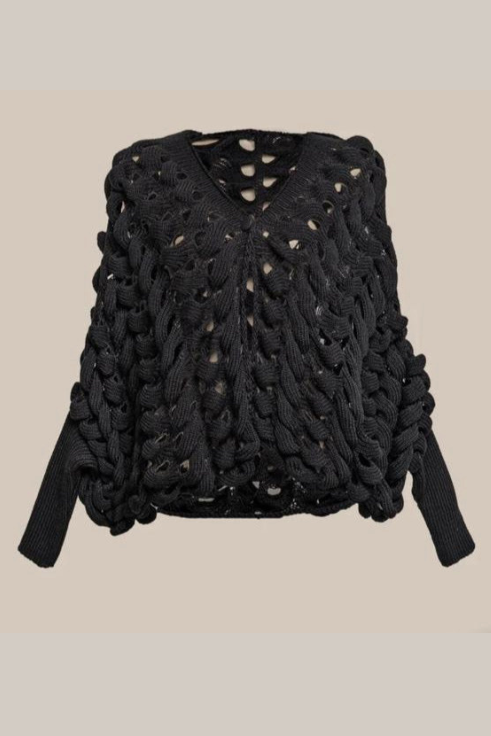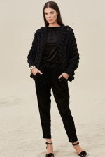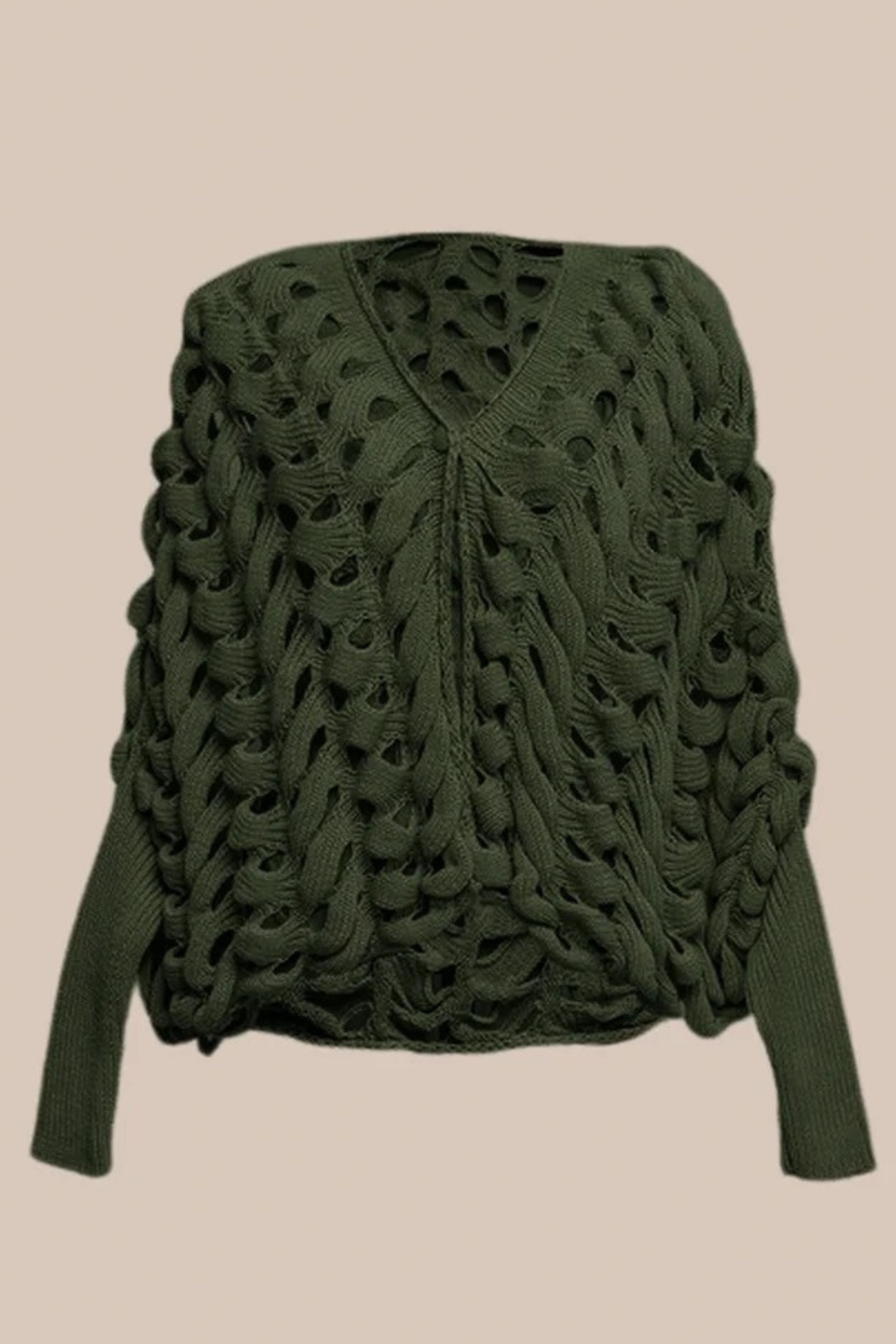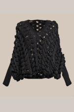 Seu guarda-roupa merece esta peça statement que une conforto absoluto, textura e design contemporâneo. Confeccionado em tricô de algodão macio, este casaqueto destaca-se pela sua trama artesanal e volumosa em maxi gomos vazados, criando um efeito visual marcante de transparência estratégica.